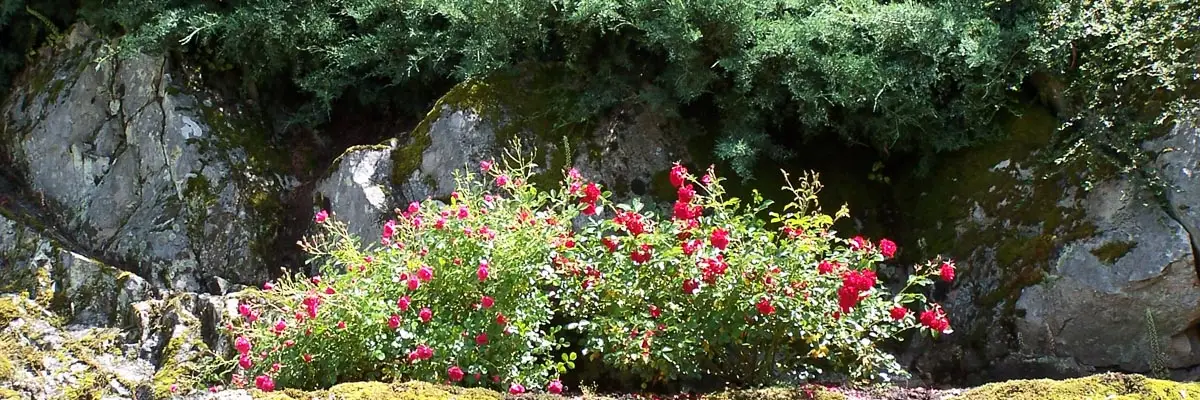 D’immenses blocs de granit surplombent la roseraie. Ils nous rappellent que cet endroit fait partie du massif armoricain qui vient jusqu’ici. Les Juniperus se plaisent tout particulièrement sur ce dôme rocheux.
