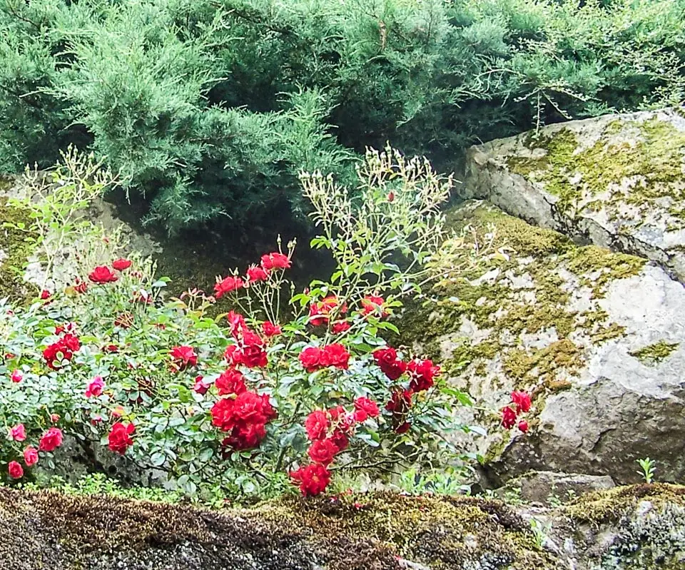 Même les rosiers réussissent à s’installer malgré le peu de terre de surface.
