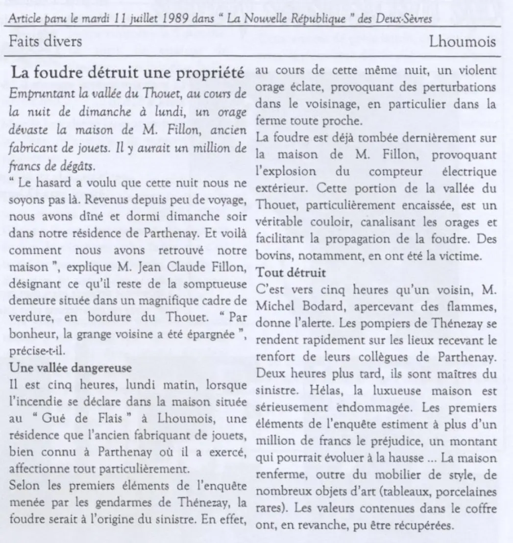 En 1989, le 10 juillet précisément, au petit matin, un violent orage déclenche un incendie dans la maison d’habitation. Il n’y a personne sur place. Quand le voisin, à son lever, alerte les pompiers, il est déjà trop tard … Les dégâts sont considérables !