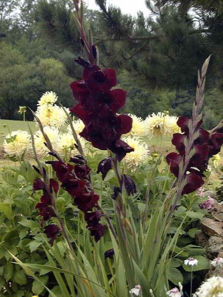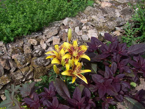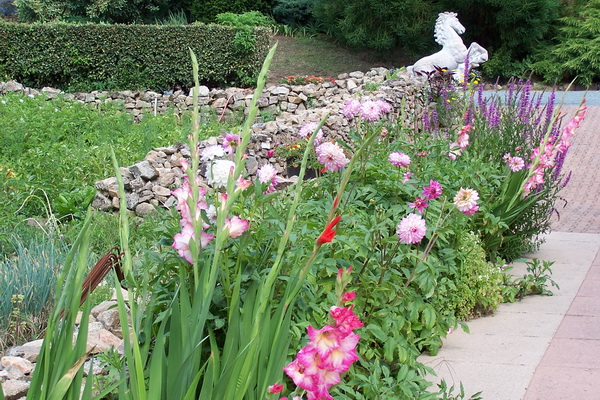 C’est un espace qui orne l’entrée du potager et qui est principalement garni à la belle saison , avec notamment, primevères et céraistes au printemps, lis, cléomes, glaieuls en été, prolongés par amaranthes et ricins jusqu’en automne.