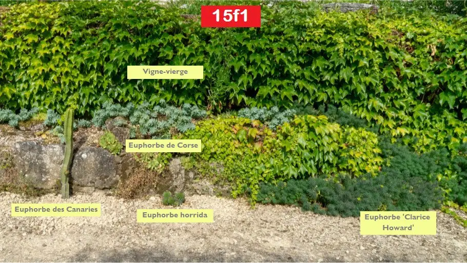 Elle est entourée par d’autres euphorbes venant d’horizons très variés, comme l’euphorbe des marais ou à l’opposé, l’Euphorbe des Canaries qui vient plutôt de zones arides.
