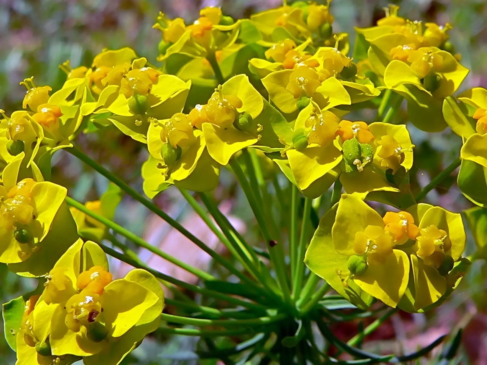 Les euphorbes ne possèdent pas de « vraies » fleurs visibles. Leur inflorescence typique est le cyathe, une structure regroupant fleurs mâles et femelles entourées de bractées colorées souvent jaune, vert acide ou parfois orangées.