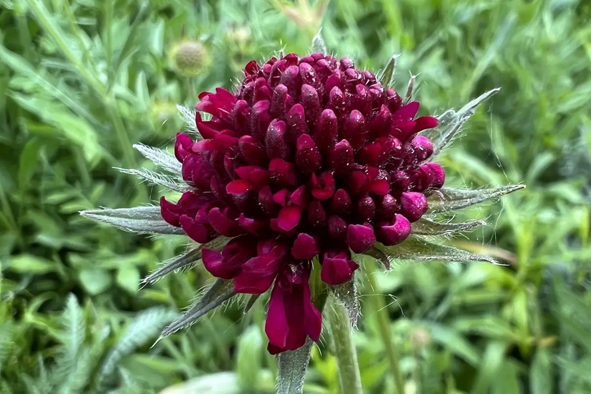 La scabieuse de Macédoine (Knautia macedonica) produit de jolis pompons rouge foncé en été pendant plusieurs mois. C’est une plante très mellifère qui fait le bonheur des butineurs.