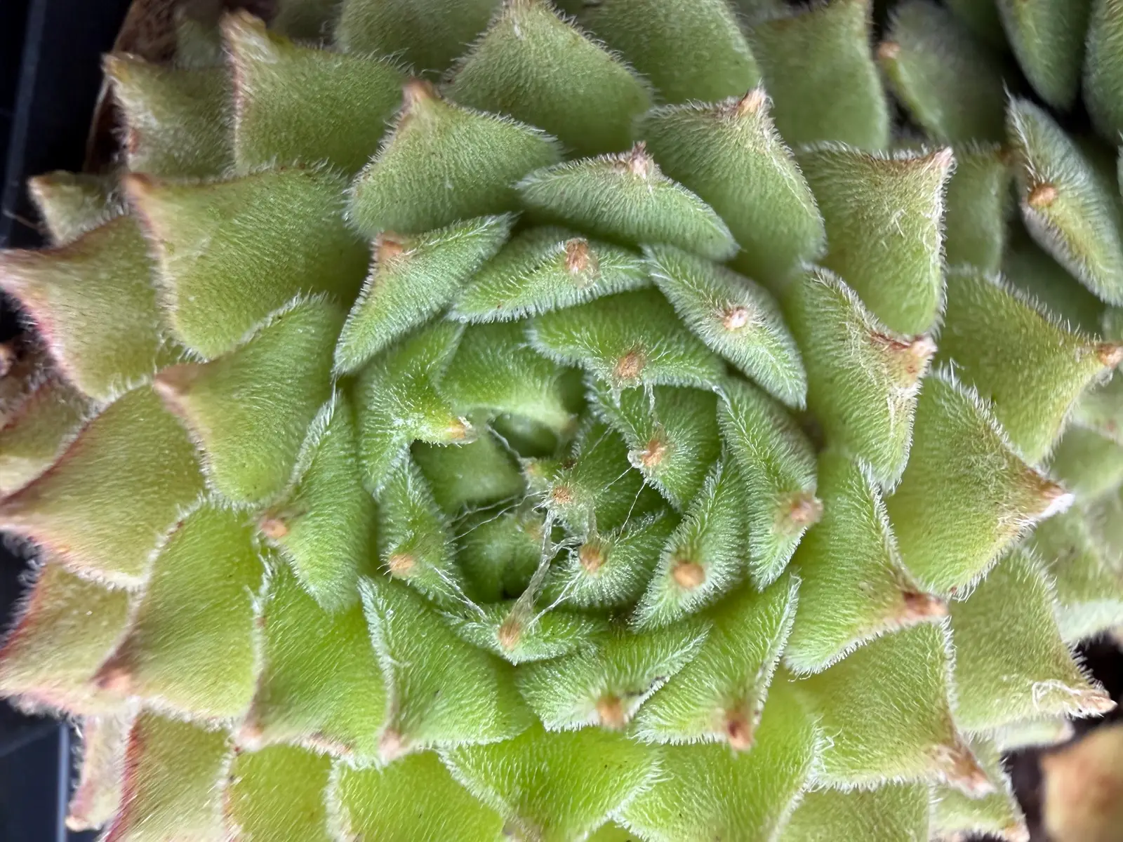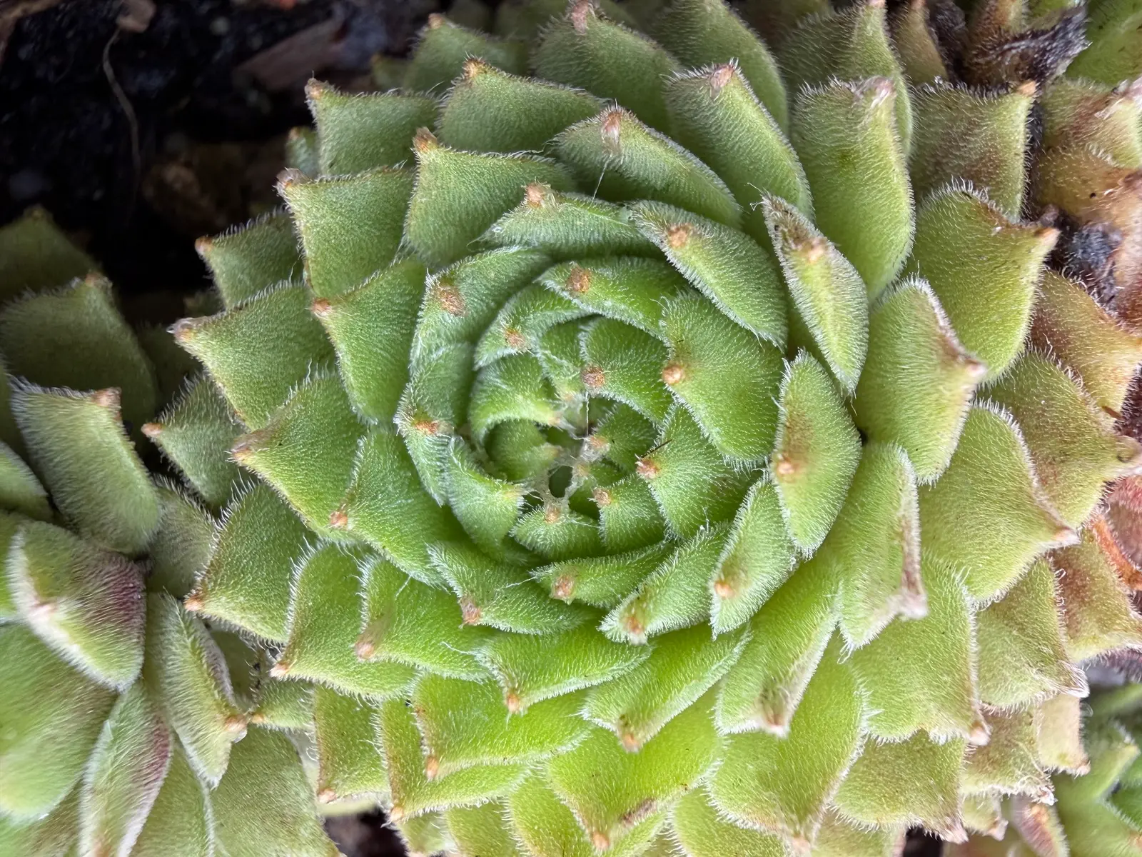 La plante forme rapidement des coussins compacts et vivants, composés de nombreuses petites rosettes géométriques. Chaque rosette présente une architecture spiralée très nette, typique des joubarbes alpines, mais ici adoucie par des teintes fraîches et naturelles : vert tendre, parfois légèrement rosé aux extrémités selon la saison, avec une fine pilosité marginale qui lui donne un aspect velouté et presque givré.