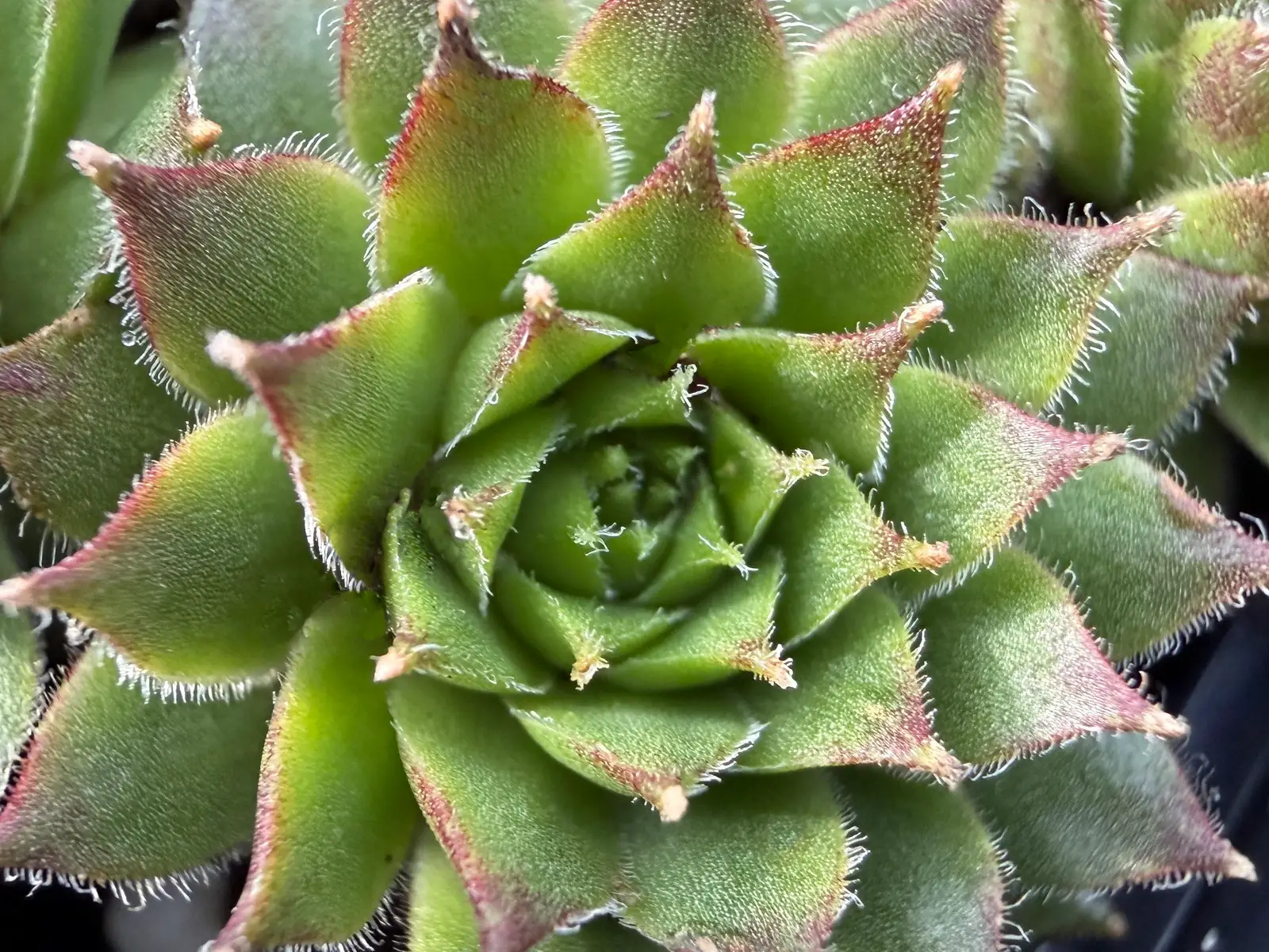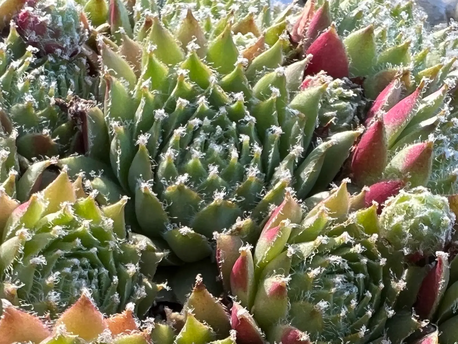 Vu de près, chaque rosette évoque une petite sculpture vivante : feuilles triangulaires vert lumineux, pointes rosées à rouge vineux selon l’ensoleillement, et surtout cette dentelle arachnéenne typique qui capte la rosée du matin.