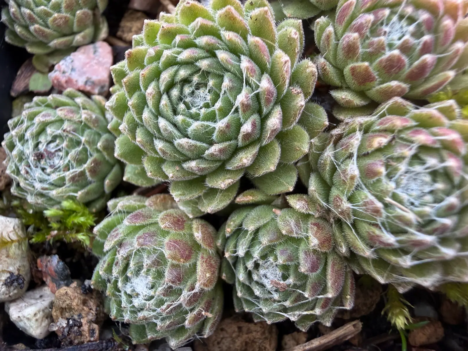Sempervivum arachnoideum ‘Silberina’ est une joubarbe miniature particulièrement décorative, formant des rosettes serrées couvertes d’un réseau dense de fils blancs évoquant une fine toile d’araignée, caractéristique des formes dites arachnoideum.