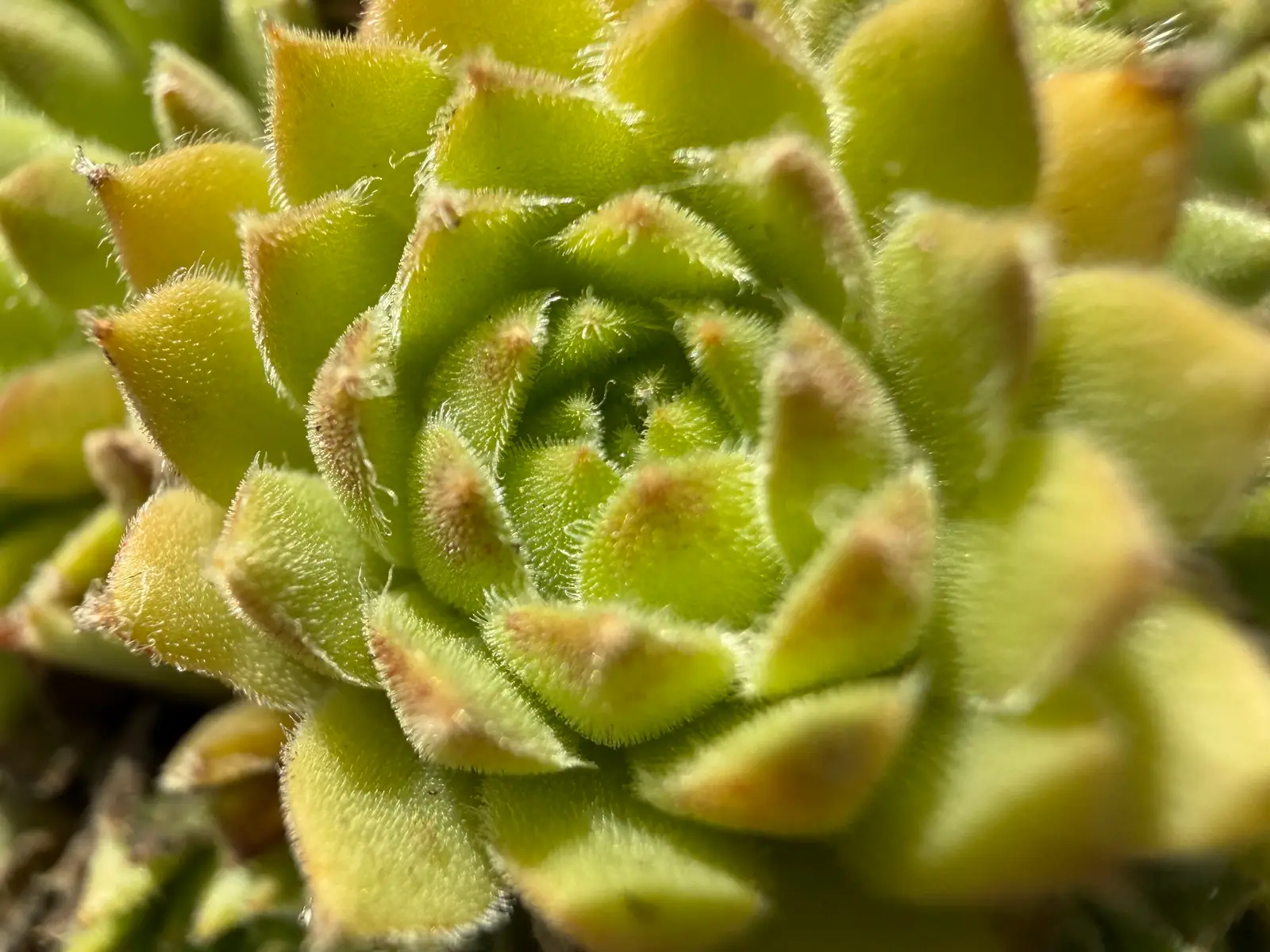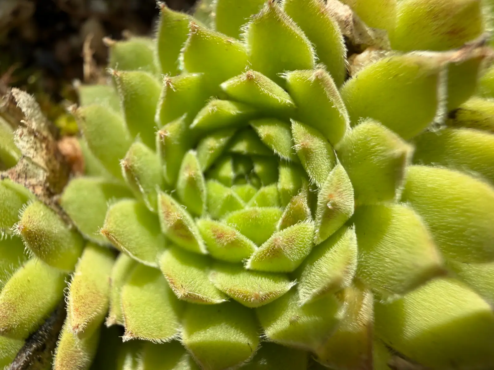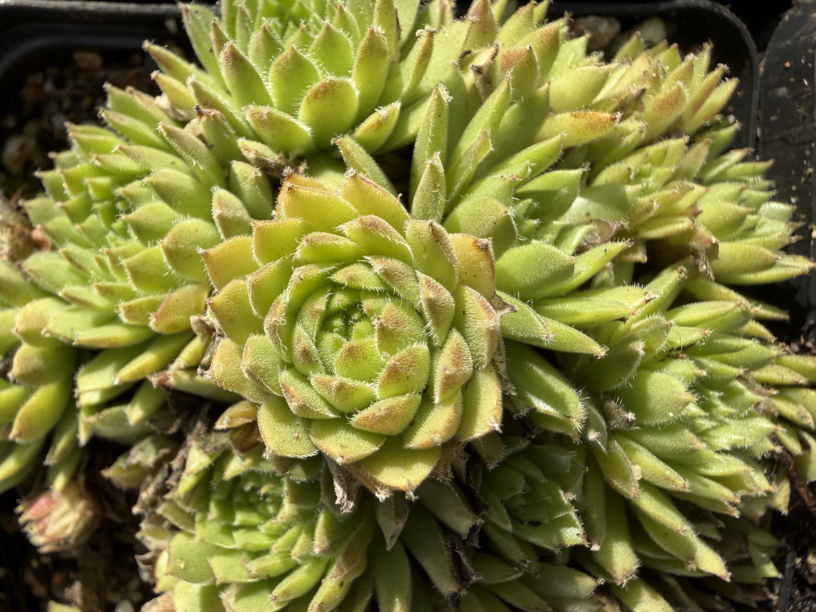 Les rosettes, de taille moyenne, présentent des feuilles vert tendre à vert jaune lumineux, dont les pointes prennent souvent des nuances brun-rosé à cuivrées, particulièrement visibles en période sèche ou sous forte luminosité. Les feuilles sont couvertes d’un fin duvet court, donnant à la plante un aspect doux et mat très décoratif.