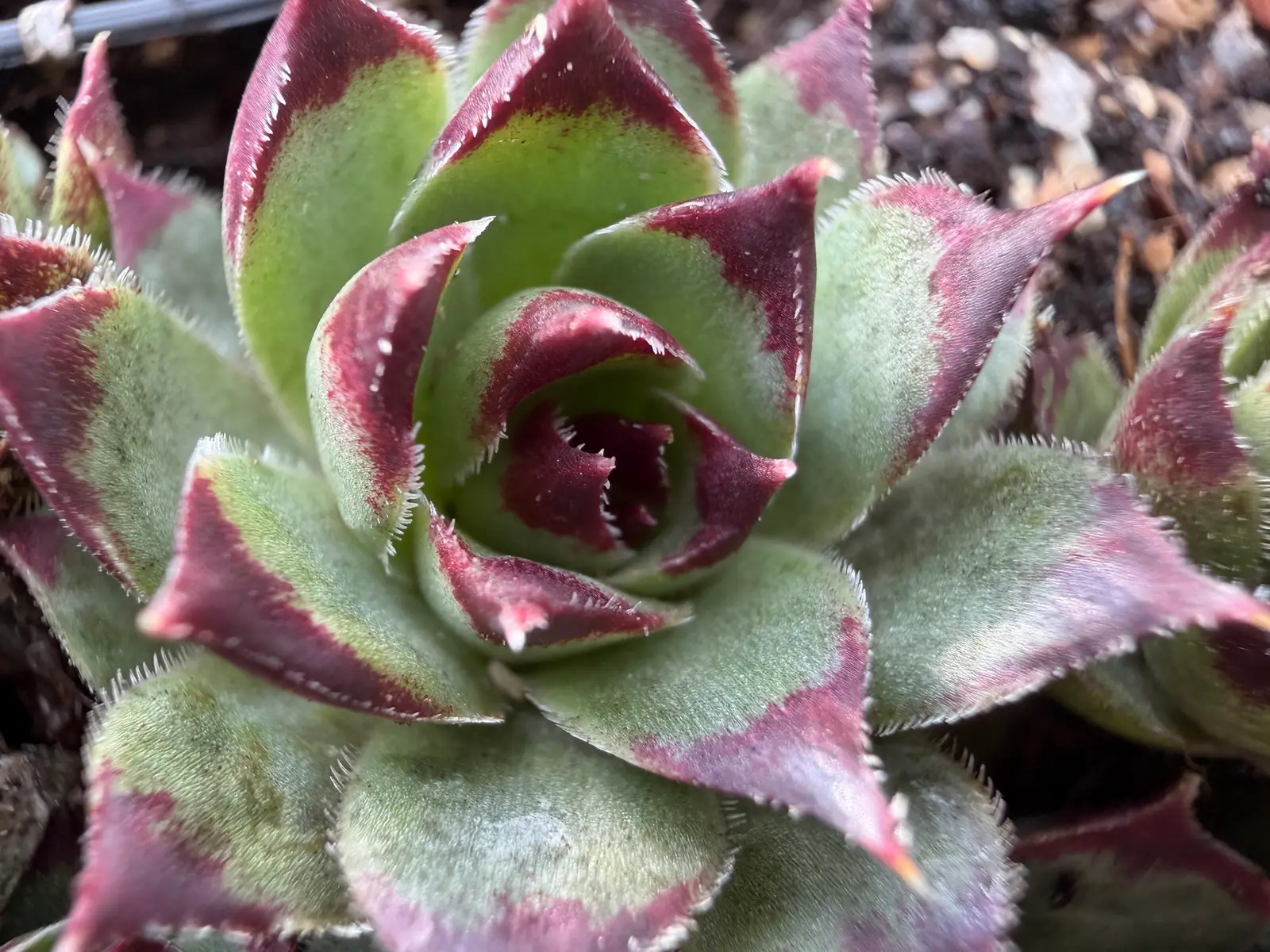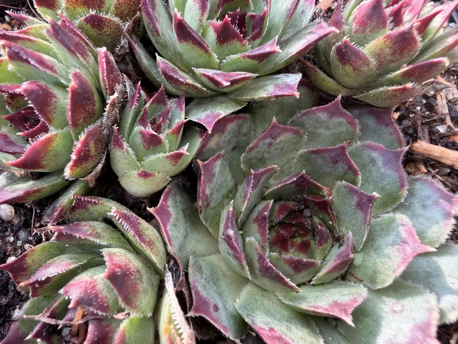 Les rosettes, larges et bien ouvertes, montrent un feuillage vert pâle à vert glauque, souvent légèrement argenté, rehaussé de larges macules pourpre rouge à l’extrémité des feuilles. Ces pointes colorées s’intensifient avec le soleil, le froid et la sécheresse, donnant à la plante un aspect très graphique.